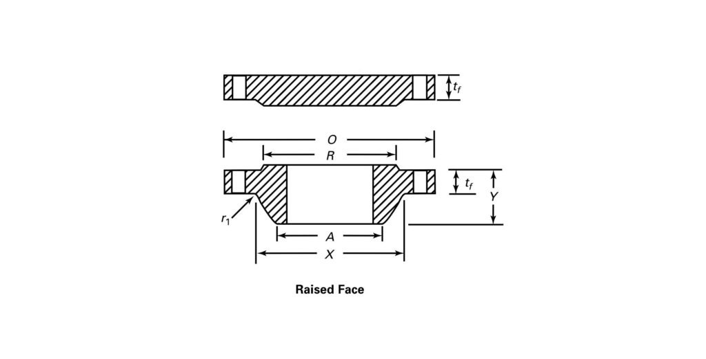 | NPS | O.D. of Flange O | WNF tf | Blind tf | Hub Length Y | Hub Dia. X | Hub Top Dia. A | Raised Face Dia. R | Bolt Circle Dia. | Bolt Qty | Bolt Hole Dia. | Bolt Dia. | Min Fillet Radius r₁ | WNF (lbs) | Blind (lbs) |
