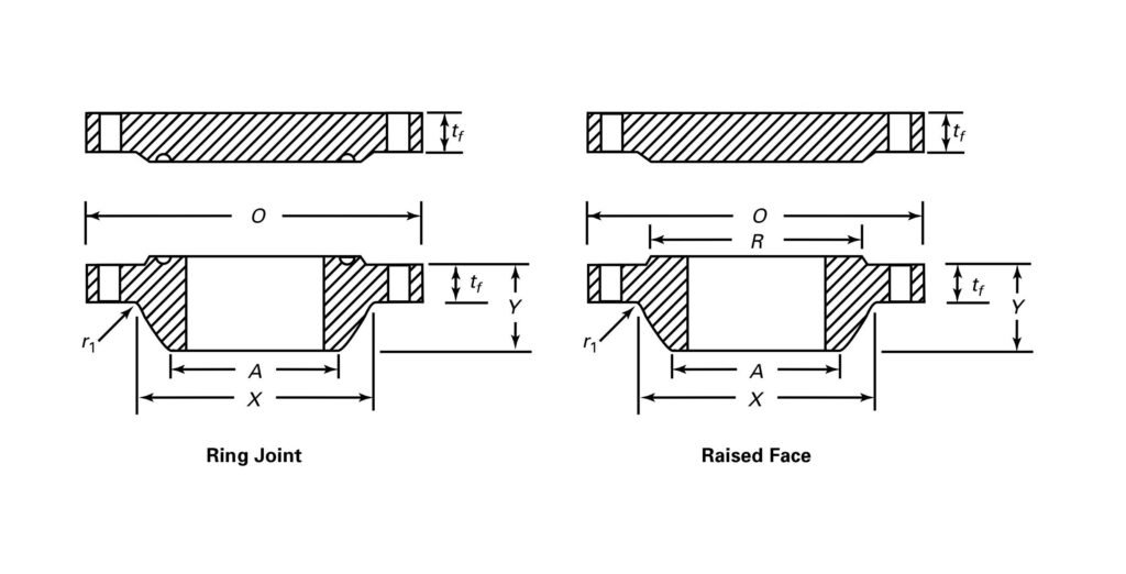 | NPS | O.D. of Flange O | WNF tf | Blind tf | Hub Length Y | Hub Dia. X | Hub Top Dia. A | Raised Face Dia. R | Bolt Circle Dia. | Bolt Qty | Bolt Hole Dia. | Bolt Dia. | Min Fillet Radius r1 | WNF (lbs) | Blind (lbs) |